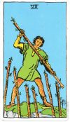「束縛(そくばく)、忍耐(にんたい)を表す「剣(けん)の8の正位置」が今週のあなたのカードです。このカードと縁の深い火星は上昇宮(じょうしょうきゅう)と重なっており、12日には葛藤(かっとう)しがちです。現状(げんじょう)を維持(いじ)すると良い時期です。周囲の状況(じょうきょう)を観察(かんさつ)しタイミングを図(はか)ることで、更に運気はアップします。」