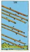 「急展開、新たな方向性を表す「杖の8の正位置」が今週のあなたのカードです。このカードと縁の深い火星は海王星の影響を受け、17日には、嗜好品(しこうひん)への依存(いぞん)に要注意です。迅速(じんそく)な判断が道を開く時期です。躊躇(ちゅうちょ)せず、流れに乗ることで、更に運気はアップします。」