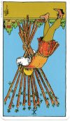 「重圧(じゅうあつ)、断念(だんねん)を表す「杖の10の逆位置」が今週のあなたのカードです。このカードと縁の深い太陽は現在、天秤座に在(あ)り、11日は、優柔不断(ゆうじゅうふだん)な傾向(けいこう)です。肩の力を抜くと良い時期です。落ち着いて、状況(じょうきょう)を見極(みきわ)めることで、更に運気はアップします。」